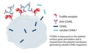 Immune complexes containing clusters of IgG have been reported to activate platelets via FcgRIIA receptors. An example is ruplizumab (BG9588), an IgG1 antibody against CD40L, where clinical trials for the treatment of systemic lupus erythematosus were halted due to thromboembolic events occurring in patients. Once investigated, platelet testing studies in vitro showed immune complexes containing anti-CD40L mAbs and soluble CD40L (sCD40L) activating platelets through FcgRIIA. Soluble CD40L is a cleaved form of CD40L present on activated T-cells, macrophages, and endothelial ells but the major source of sCD40L comes from activated platelets.It is possible that sCD40L cleaved from platelets upon stimulation mediates the formation of anti-CD40L and sCD40L immune complexes that in turn activate platelets.
