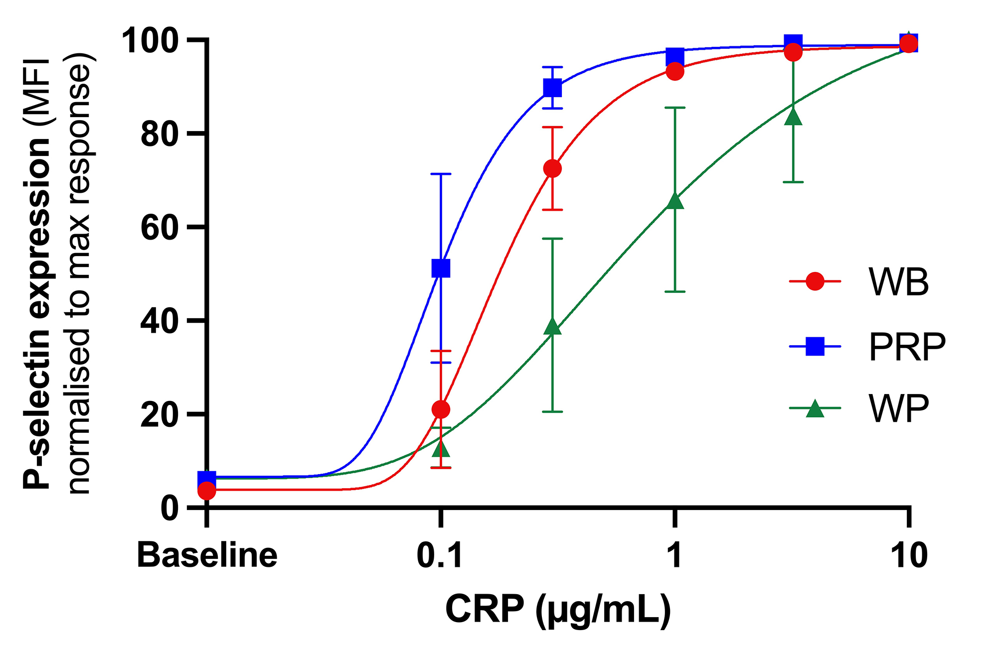 P-selectin expression in whole blood (WB), platelet rich plasma (PRP) and washed platelets (WP) in response to stimulation with a range of concentrations of collagen related peptide (CRP) presented as P-selectin/FITC median fluorescence normalised to a maximum response within a sample.
