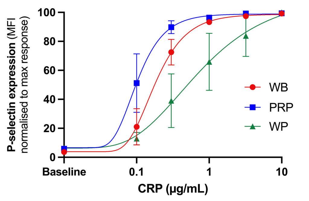 Platelet activation can be assessed in whole blood, platelet rich plasma or isolated (washed) platelets. Similarly to aggregation, the profile of platelet responses would differ in all three matrices.