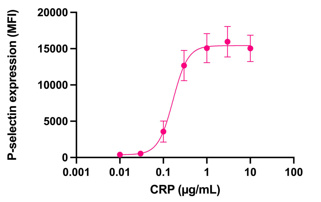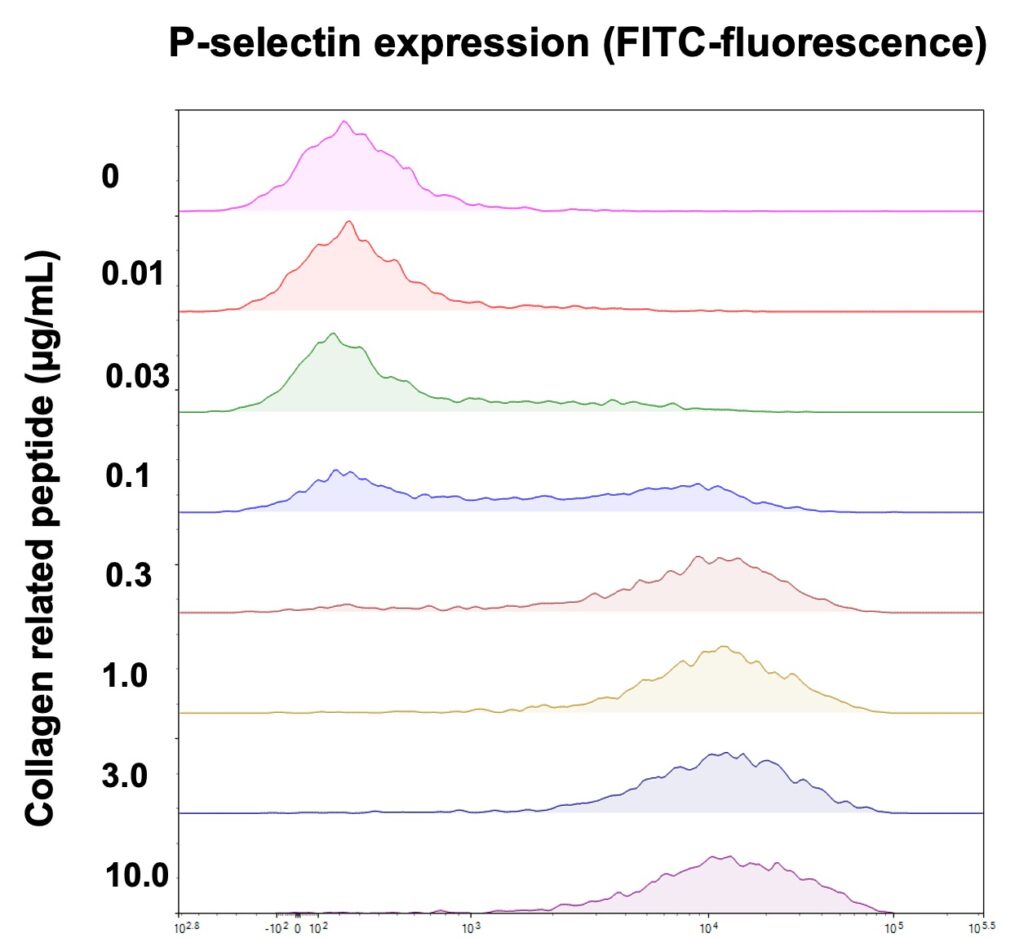 Samples are fixed after stimulation and the analysis of P-selectin expression can be performed at a later stage. This is an end-point assay and a very small volume of sample is required to run this test, which makes this approach a desirable high-throughput platelet assay if multiple compounds/conditions need to be assessed.