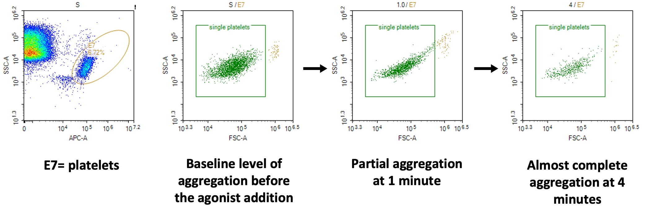 Single platelet counting by flow cytometry measures platelet aggregation in whole blood as a decrease in the number of single platelets over time after stimulation with an agonist and is particularly sensitive to platelet micro-aggregate formation. The advantage of this approach is that the samples can be stabilised using a dedicated fixative, which allows the analysis to be carried out at a later stage.