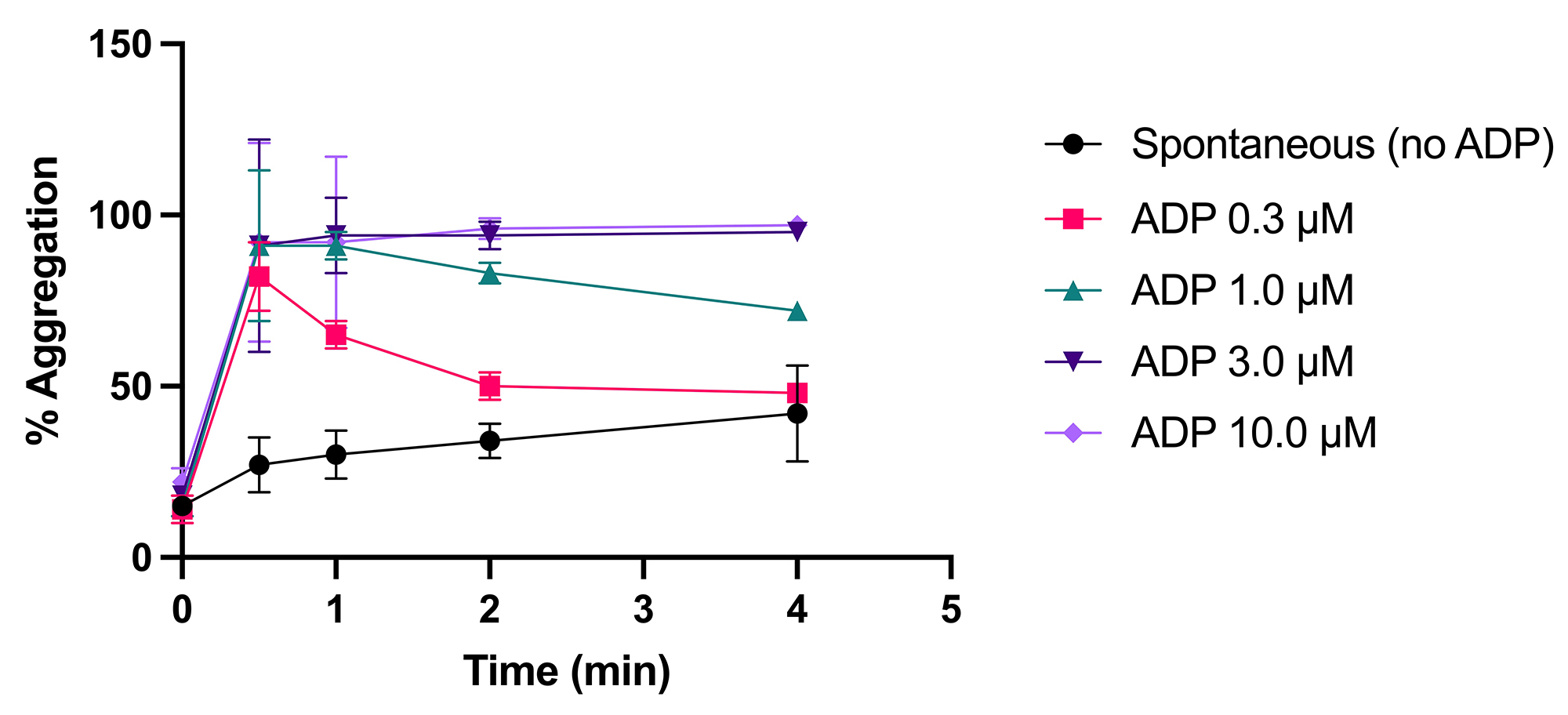 The samples can be fixed at several time-points providing data on dynamic aggregation response, similarly to LTA, with aggregation calculated and expressed as area under the curve (AUC). Alternatively, samples can be fixed at a single time-point offering a high throughput endpoint assay capable of generating numerous dose-response curves.
