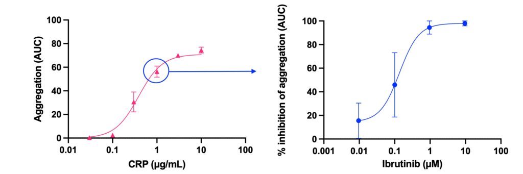 Aggregation response to a range of concentrations of collagen related peptide (CRP) measured in whole blood (WB) by impedance and presented as area under the aggregation curve (AUC) (left graph) and inhibition of CRP-induced aggregation (at 1.0 µg/mL) by ibrutinib, a tyrosine kinase inhibitor (dose response curve to ibrutinib, right graph).